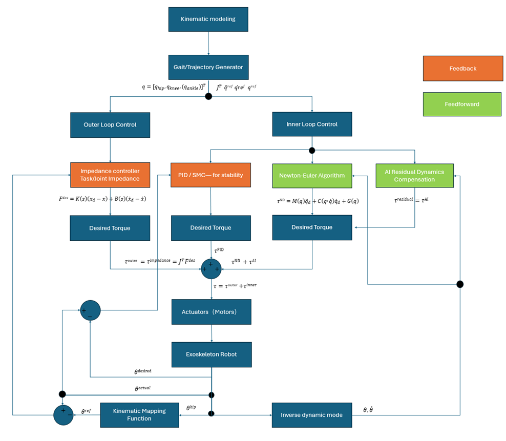 The proposed control strategy adopts a hierarchical outer–inner loop architecture to generate safe and adaptive assistance during stair climbing. A gait/trajectory generator first produces desired joint profiles based on kinematic modeling. The outer loop regulates task-level behavior through an impedance controller, shaping the interaction dynamics between the user and the exoskeleton and producing a task-consistent desired torque. In parallel, the inner loop ensures joint-level stability and precise tracking by combining model-based feedforward dynamics—computed via the Newton–Euler algorithm—with feedback terms such as PID or sliding-mode control. To address modeling errors, user-specific variability, and unmodeled dynamics, an AI-based residual compensation module estimates and counteracts the remaining disturbances in real time. The resulting torques from impedance, model-based feedforward, and AI residual compensation are integrated and applied to the actuators, while inverse kinematics and sensing feedback update joint estimates for the next control cycle. This unified framework allows the controller to remain robust, adaptive, and compliant during human–robot interaction.